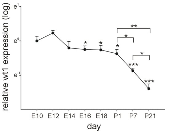 To analyze systematically cardiac Wt1 expression during embryonic development and after birth, we measured its expression in heart tissue at different time points by quantitative RT-PCR (Figure 1). For this purpose, RNA was isolated from hearts including epicardium, myocardium, and endocardium, but excluding atria and outflow tract. In the developing heart of mouse embryos, we detected the highest Wt1 expression levels between E10.5 and E12.5, when the covering of myocardium with Wt1 positive progenitors should be accomplished []. In our study, Wt1 mRNA levels gradually decreased from E14.5, followed by a sharp drop after birth. Nevertheless, we were able to detect cardiac Wt1 mRNA expression until the end of observation period, at postnatal day (P) 21.