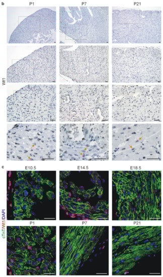 - Duim, S.N.; Kurakula, K.; Goumans, M.J.; Kruithof, B.P. Cardiac endothelial cells express Wilms’ tumor-1: Wt1 expression in the developing, adult and infarcted heart. J. Mol. Cell. Cardiol. 2015, 81, 127–135. [Google Scholar] [CrossRef]