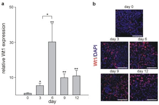 Wt1 is expressed in cardiomyocyte precursors and differentiated clones. (a) Quantitative RT-PCRs for Wt1 Randomly selected EBs were harvested on days: 0, 3, 6, 9, and 12 of culture. Expression of Wt1 was normalized to the mean of the respective Gapdh, actin, and Rplp0 expression. The Wt1 values are relative to Wt1 mRNA from day 0. The data from three independent experiments are represented as means ± S.E.M. * p ˂ 0.05, ** p < 0.01 vs. day 0. (b) Confocal images of Wt1 -labelling (red) of clones at the indicated time points. Cells were counterstained with DAPI (blue). Scale bars indicate 50 µm.