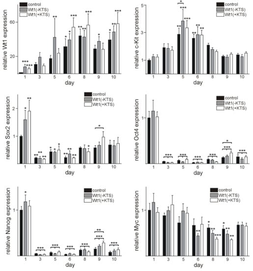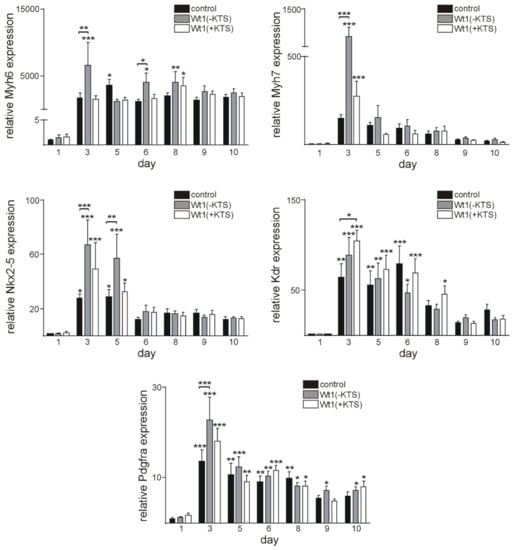 Next, we analyzed the time course of Wt1 expression in empty vector control, Wt1(-KTS), and Wt1(+KTS) expressing clones (Figure 5). Wt1 expression increased on days 6, 8, and 10 of differentiation in the empty vector control group compared to the 1-day post-transfection time point. Significantly higher Wt1 mRNA values were observed on day 5, 6, 8, 9, and 10 compared to 24 h in the Wt1(-KTS) group, while significantly higher Wt1 mRNA levels were detected only on days 6, 8, and 10 in the Wt1(+KTS) group. The upregulation of Wt1 expression during cardiomyocyte differentiation in all groups resembles the situation in non-transfected cells, mentioned above, without an additional significant effect of the initial transient overexpression of the Wt1(-KTS) and Wt1(+KTS) constructs.