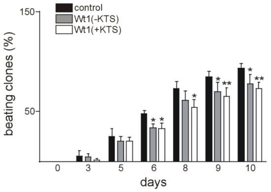 Wt1 overexpression delays functional cardiomyocyte differentiation. Wt1(-KTS), Wt1(+KTS), or empty vector controls were electroporated in mESCs. Hundred embryonic bodies were established per experiment and the number of beating clones counted at the indicated time points. Data from four independent experiments are represented as means ± S.E.M. * p < 0.05, ** p < 0.01.