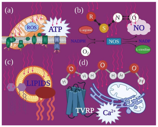 Lastly, lipids in the near-infrared wavelength region showed two peaks of absorption at 1210 and 1720 nm, but also, a subsequent third peak in the 900–1000-nm range [92]; as previously described, this could lead to a membrane fluidity modification and an influence on mitochondria. The change in membrane fluidity and the vibrational modification of water molecules can play a role in Ca2+ release from the TRPC [93] but, also, in a mitochondrial reserve [94,95]. In a previous review, we showed that the effect of light on Ca2+ homeostasis can have a key role in mitochondrial metabolism and NO release, in a peculiar system that could be described as “like a dog chasing its own tail” [71].