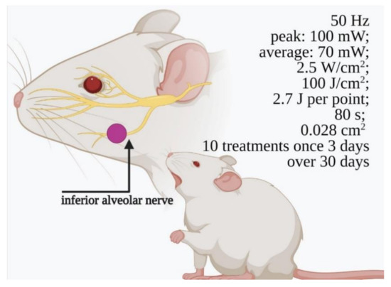 The authors concluded that a therapy based on laser parameters, such as: frequency 50 Hz of a pulsed wave, peak radiant power of 100 mW, average radiant power of 70 mW, the irradiance at the target of 2.5 W/cm2, radiant exposure of 100 J/cm2, radiant energy of 2.7 J/session, total radiant energy 27 J, exposure duration of 80 s, irradiation at only one point of 0.028 cm2 beam spot size, in noncontact mode, with 10 treatments in total, delivered once every 3 days over 30 days, constituted aid for IAN injury recovery in a preclinical rat model, and could be a promising method to support clinical applications.
