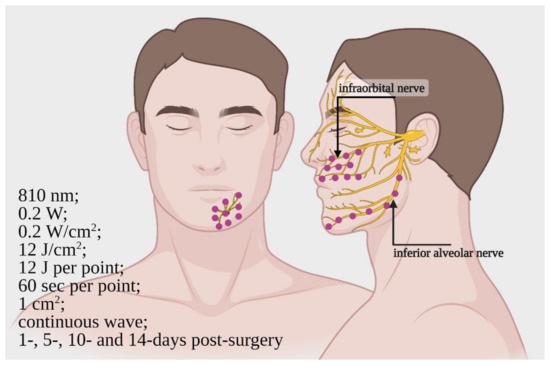The patients underwent PBM at 1, 5, 10 and 14 days post-surgery. The parameters of the PBM therapy were 810 nm; 0.2 W; 0.2 W/cm2; 12 J/cm2; 12 J; 60 s per point; 1 cm2; and a continuous wave mode of irradiation. For ION recovery, the irradiation was performed on three areas between the upper lip philtrum, lateral nasal alae, lower eyelid, malar eminences and continuation of the lip commissure line (total of 10 points). For IAN recovery, the irradiation was performed near the mandibular canal, from the mandibular angle to the chin area (7 points) and from the mental foramen area to the midline (9 points). The design of the irradiation modality is shown in Figure 3.