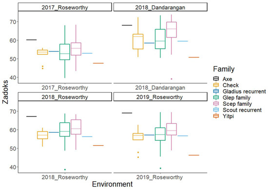 Boxplots of Zadoks’ score (maturity) BLUPs in four different environments for the subset of the Wheat Hub NAM population and the check varieties. The NAM subset population is separated into Gladius and Scout families. BLUPs for Axe and Yitpi represent the selection thresholds for Zadoks’ score.