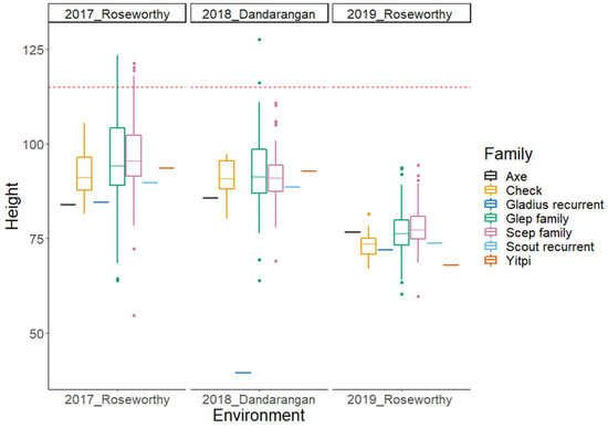 Boxplots of plant height BLUPs for the subset of the Wheat Hub NAM population and the check varieties in three different environments. The NAM subset population is separated into Gladius and Scout families. The horizontal dotted line represents the selection threshold of 115 cm for plant height.