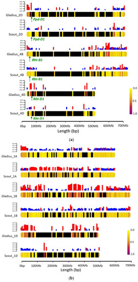 Chromosome heat maps showing proportions of exotic and reference parent alleles on different chromosomes: (a) Chromosomes 2D, 4B and 4D. The loci for relevant genes are indicated; (b) Chromosome 1. Bars on top of each chromosome represent the frequency of exotic alleles at each locus. Bars in red represent exotic allele frequencies greater than or equal to 0.25. Black segments on the chromosomes show regions of the chromosome with no markers in the data set.