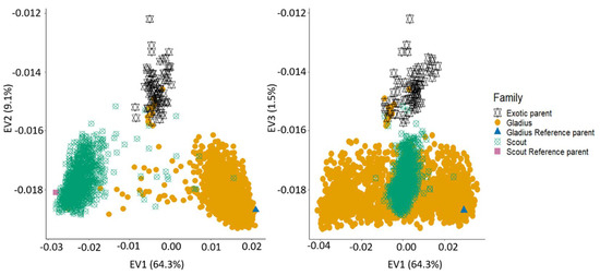 Population structure evaluation for the whole NAM population combined with the parents revealed three distinct groups: the exotic parents, the Gladius families and the Scout families. As expected, the reference parents clustered with their respective families. The first eigenvector explained 64.3% of the variation while the second and third eigenvectors explained 9.0% and 1.5%, respectively (Figure 4). There was a slight overlap between a few of the Gladius and Scout lines, with each other and with the exotic parents. This could be explained by the unintentional mislabelling of some Gladius lines as Scout lines and vice versa. The overlap with the exotic parents may be attributed to accidental selfing during population development.