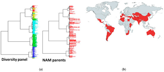 Characteristics of the NAM exotic parents (a) Phylogenic trees showing diversity in the diversity panel from which the diverse exotic parents were selected. The NAM parents are highlighted from the phylogenic tree; (b) geographical distribution of the NAM exotic parents.