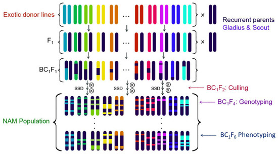 In order to combine the strengths of bi-parental and association mapping, a Nested Association Mapping (NAM) approach was developed [17]. A NAM population offers increased allelic diversity, samples of both recent and historic recombination events, and reduces the confounding effect of population structure [18]. A NAM population comprises a large set of related progenies within multiple bi-parental populations developed by selecting a diverse set of founder lines and crossing them to a common reference parent. Founder lines in a NAM are ideally chosen to maximize genetic diversity and can, therefore, include exotic germplasm, wild relatives and landraces. The reference parent is usually a well-characterised, locally adapted elite line [17]. The incorporation of genetically diverse founder lines introduces novel genetic diversity, while crossing the founder lines with a common reference line balances the need for genetic diversity with elite performance. The NAM design results in progeny genomes that are a mix of chromosome segments from either the diverse founder lines or the common parent [17]. The reshuffling of parental genomes breaks down population structure while introducing recent recombination events [17]. First developed in maize genetics studies, the NAM design has been a successful tool in dissecting the genetic architecture of traits in various crops [19,20,21,22].