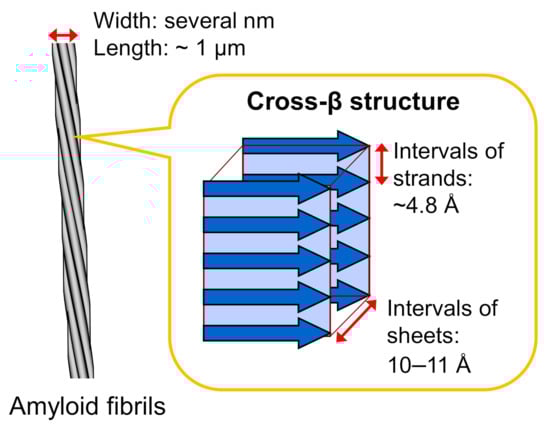 Amyloid fibrils typically have a hierarchical structure in which several protofilaments a few nanometers in width and around a micrometer in length are laterally bundled. Each protofilament consists of a cross-β structure with β-strands stacked perpendicular to the long axis of the fibril through a hydrogen-bonding network (Figure 1). This basic structure was initially revealed in the 1950s by studies of X-ray fiber diffraction and electron microscopy [15,16], and the elucidation of more detailed structural properties has progressed since then by applying various physicochemical methods. In the early stages of structural research, the cross-β structured regions within the constituent polypeptide chains were identified by using limited proteolysis or hydrogen/deuterium exchange in combination with NMR or mass spectrometry [17,18].