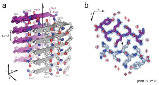 Structure of a steric zipper formed by the short peptide GNNQQNY. (a) Side view and (b) top view of the pair of β-sheets are shown. In (a), the backbone of each β-strand is represented as an arrow, and the side chains protruding from the backbones are shown as ball-and-stick models. In (b), two GNNQQNY molecules are shown as stick models, and their interface demonstrates the shape complementarity of the asparagine and glutamine side chains. Reprinted from [19] with permission. Copyright (2005) Springer Nature.