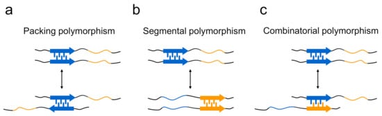 Three proposed models explaining the formation mechanism of polymorphs in terms of steric zippers. (a) Polymorphs are produced when steric zippers are formed with different packing patterns or with different interfaces between the same pair of segments (i.e., packing polymorphism). (b) In the case of polypeptide chains that contain several different segments with high propensity to form steric zippers, the difference in region of steric zippers is another mechanism for forming polymorphs (i.e., segmental polymorphism). (c) Additionally, differences in the sequences of paired polypeptide segments also contribute to the formation of polymorphs (i.e., combinatorial polymorphism).