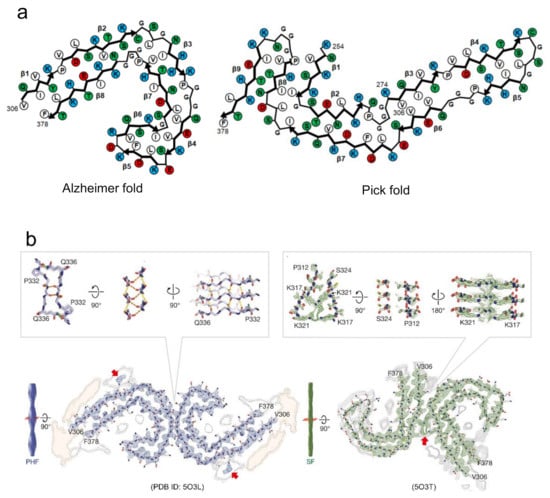 Proposed mechanism of the formation of polymorphs based on the diversity of steric zippers. (a) Tau amyloid polymorphs from Alzheimer’s and Pick’s disease patients, showing difference in protofilament folds. Schematic illustrations of the arrangements of side chains in this panel are redrawn based on those in [23,24]. Hydrophobic, polar, positively charged, and negatively charged residues are colored by white, green, blue, and red, respectively. (b) Tau amyloid polymorphs from Alzheimer’s patients, PHF and SF, showing differences in the arrangement of interactions of two protofilaments. Red arrows indicate electron densities attributed to the interaction with the side chains of K317 and K321. Reproduced with modification from [23], with permission. Copyright (2017) Springer Nature.