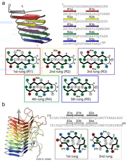 Structures of functional amyloids consisting of a β-solenoid structure. (a) The side view of the protofilament and the schematic arrangement of side chains within the protofilament of CsgA. The left-handed structure, which is one of the low-energy conformations predicted by the computer simulation, is shown as a representative example. The side view was reproduced from [64], with permission. Copyright (2014) American Chemical Society. The schematic arrangement of side chains was drawn with reference to [64]. A single polypeptide chain takes a 5-rung solenoid structure, and each rung is shown in a different color. In the schematic illustrations of the arrangements of side chains at each rung, hydrophobic, polar, positively charged, and negatively charged residues are colored in white, green, blue, and red, respectively. The R1b strand is possibly unstable compared to the other ones according to the simulated structure. (b) Side view of the protofilament and a schematic illustration of the side chain arrangements within the protofilament of HET-s(218-289). Reproduced with modification from [67], with permission. Copyright (2008) Springer Nature. In the side view, five polypeptide chains constituting a β-solenoid structure, each of which takes a 2-rung solenoid, are shown in different colors. In the schematic illustrations of the arrangements of the side chains at each rung, hydrophobic, polar, positively charged, and negatively charged residues are colored in white, green, blue, and red, respectively.