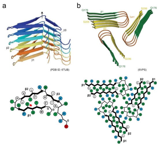 Recently, the detailed structures and interactions underlying amyloid polymorphism have revealed by atomic structures of various proteins [15,26]. Overall, the structures of amyloid polymorphs can be characterized by diverse folds within a protofilament or different interactions between protofilaments. In the polymorphs of tau filaments from Alzheimer’s and Pick’s disease patients revealed by cryo-EM, two different protofilament folds were observed [23,24] (Figure 5a). Although both folds share a similar β-strand composition, different β-strands are paired to form hetero-steric zippers. As a result, the main chain shows different folding patterns with distinct turn conformations. A similar difference in the protofilament fold was also observed among the polymorphs of IAPP [51], among those of TAR DNA-binding protein 43 (TDP-43) [52], and between the rod and twister polymorphs of α-synuclein fibrils [25]. In the latter case, the protofilaments of both polymorphs commonly form ordered bent β-arch folds, whereas the twister polymorph additionally forms a Greek-key-like fold using some terminal residues. These observations indicate that the different folds of protofilaments are a fundamental factor in the formation of amyloid polymorphs.