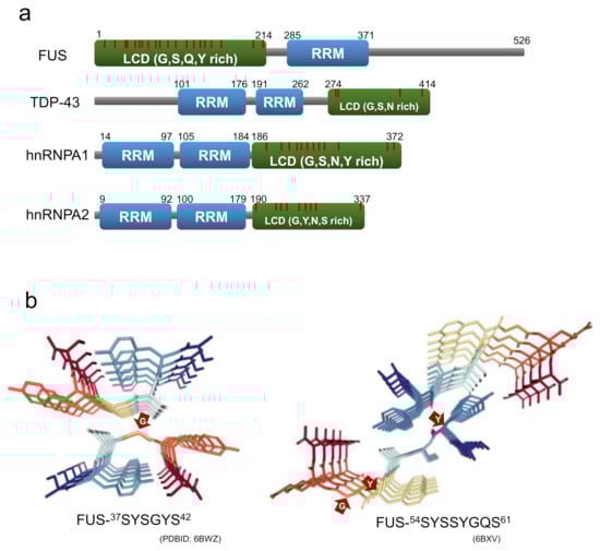 - Luo, F.; Gui, X.; Zhou, H.; Gu, J.; Li, Y.; Liu, X.; Zhao, M.; Li, D.; Li, X.; Liu, C. Atomic structures of FUS LC domain segments reveal bases for reversible amyloid fibril formation. Nat. Struct. Mol. Biol. 2018, 25, 341–346. [Google Scholar] [CrossRef] [PubMed]