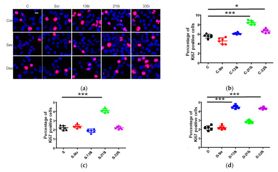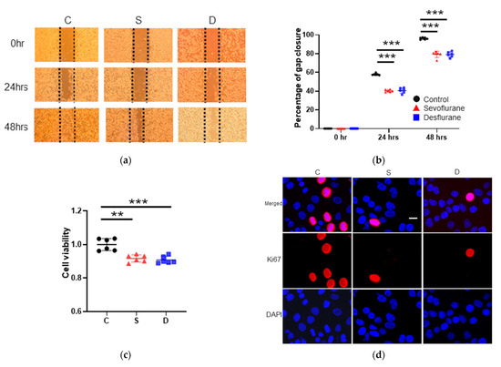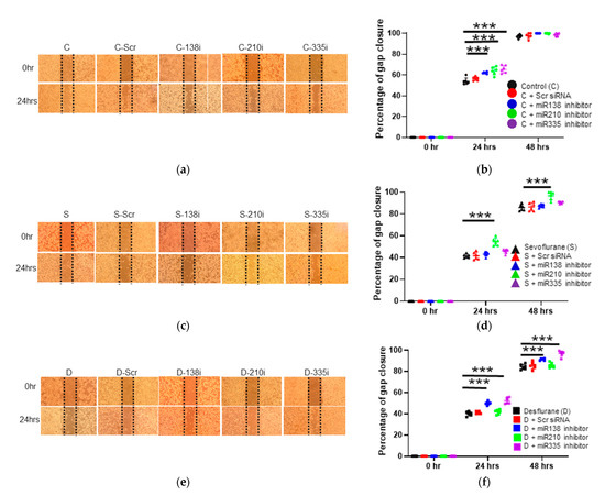 2.3. The Inhibition of miR-138, -210 and -335 Reversed the Sevoflurane- and Desflurane-Induced Suppression of Proliferation and Migration