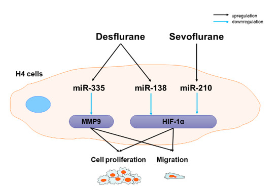 Ishikawa, M.; Iwasaki, M.; Zhao, H.; Saito, J.; Hu, C.; Sun, Q.; Sakamoto, A.; Ma, D. Inhalational Anesthetics Inhibit Neuroglioma Cell Proliferation and Migration via miR-138, -210 and -335. Int. J. Mol. Sci. 2021, 22, 4355. https://doi.org/10.3390/ijms22094355
