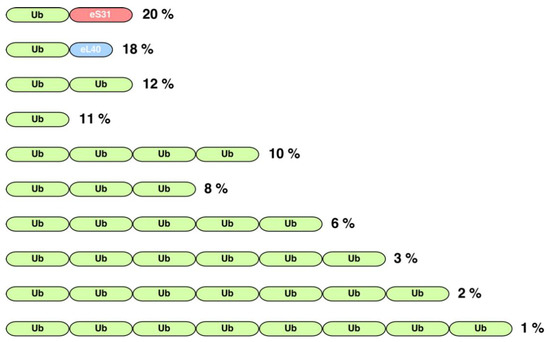 - Finley, D.; Bartel, B.; Varshavsky, A. The tails of ubiquitin precursors are ribosomal proteins whose fusion to ubiquitin facilitates ribosome biogenesis. Nature 1989, 338, 394–401. [Google Scholar] [CrossRef]