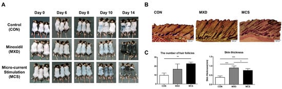 APA StyleHwang, D., Lee, H., Lee, J., Lee, M., Cho, S., Kim, T., & Kim, H. (2021). Micro-Current Stimulation Has Potential Effects of Hair Growth-Promotion on Human Hair Follicle-Derived Papilla Cells and Animal Model. International Journal of Molecular Sciences, 22(9), 4361. https://doi.org/10.3390/ijms22094361