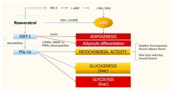 In the context of obesity, resveratrol appears to be responsible for modulating mitochondrial activity for which activation of SIRT-1 plays a key role. In mammals, SIRT-1 acts as a regulator of healthspan, protecting against aging and stressful metabolic conditions such as impaired glucose homeostasis, obesity, and cancer []. SIRT-1 is a human deacetylase that negatively regulates the p53 tumor suppressor gene, thus it promotes cell survival []. The levels of SIRT-1 are higher in the muscular tissue in the presence of caloric restriction (calorie intake lower of about 20–40%) []. The direct activation of SIRT-1 by resveratrol is controversial since in-vitro experiments have shown that the interaction between resveratrol and the artificial fluorescent substrate used could generate artifacts []. Thus, other possible pathways were searched to evaluate whether resveratrol could activate SIRT-1 indirectly.