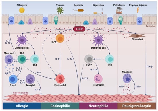 In T2-high asthma, the development, persistence, and amplification of eosinophilic inflammation are driven and orchestrated by multiple cellular elements including dendritic cells, T helper 2 (Th2) lymphocytes, group 2 innate lymphoid cells (ILC2), mast cells, basophils, and airway epithelial cells [12,13,14]. Within this endotypic context, a key pathophysiologic role is played by thymic stromal lymphopoietin (TSLP), an innate cytokine especially involved in type 2 eosinophilic inflammation, but also implicated in neutrophilic and paucigranulocytic asthma [15,16,17]. Indeed, TSLP stimulates dendritic cells to guide the differentiation of naïve Th cells towards the Th2 lineage, but can also promote Th17 commitment [15]. Moreover, TSLP activates ILC2, mast cells, and basophils, induces eosinophil survival and transmigration, and also affects the functions of airway structural cells such as fibroblasts and airway smooth muscle cells [15].