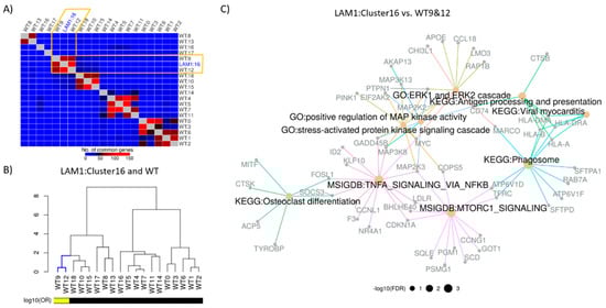 Construction and functional enrichment of disease characterizing signature. (A) WT clusters were matched with the LAM cluster in terms of top 200 most significantly (FDR < 0.05) up-regulated genes from each of the CAS. Unsupervised hierarchical clustering revealed sub-clusters of LAM and WT clusters, where LAM1cluster16 was clustered with WT clusters 9 and 12. (B) Significance of the overlaps between LAM and WT cell clusters based on the significantly (FDR < 0.05) up-regulated genes were assessed via Fisher’s exact test. Cluster similarities were measured using log10 odds ratio and hierarchical clustering of LAM1cluster16 vs. WT is visualized via dendrograms. Log10 odds ratio (OR) of 1 or more is indicated by the yellow color. (C) Disease characterizing signatures of LAM were constructed by comparing LAM1cluster16 with the WT cluster 9 and 12. Functional enrichment of top 200 most significantly (FDR < 0.05) up-regulated genes was carried out in terms of KEGG/MSigDB (Hallmark)/GO (Biological processes) categories. Selected functional classes based on the cutoff of FDR adjusted p-values < 0.1 are represented by different edge colors and size of the node is proportional to negative logarithm of FDR adjusted p-value.