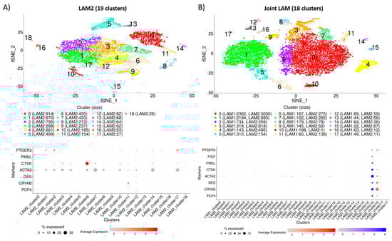 Cluster analysis of LAM2. (A) Unsupervised clustering of 6545 cells from LAM2 is represented in two-dimensional t-SNE plots (top panel) with perplexity 30. A total of 19 clusters were identified in each sample using Seurat’s graph-based clustering initialized with top principal components with largest variances. Expression of known LAM markers was used to identify the cluster of LAM cells (bottom panel), with the size of the dot representing the percentage of cells expressed and color is proportional to the average expression of the genes. (B) Integrated clustering of 13,789 cells from both LAM1 (7244 cells from LAM1) and LAM2 (6545 cells from LAM2) identified 18 clusters where each cluster consisted of both LAM1 and LAM2 cells (top panel). Seurat’s implementation of integrated clustering was used to identify common cell clusters between LAM1 and LAM2. Clusters are colored and labeled uniquely, and the number of cells in each cluster is noted inside the parenthesis in the legends. Six out of eight LAM markers show moderate to high expression in at least 25% cells in both LAM1 (63 cells) and LAM2 (12 cells) of cluster 16 (bottom panel).