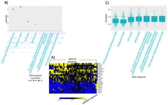 Connectivity analysis of naïve LAM signature. (A) Top 250 most up/down regulated genes from LAM characterizing signature were selected and matched with 978 LINCS-L1000 landmark genes. Pearson’s correlation were computed between each of the LINCS-CP and LAM signature. Top 50 LINCS-CP signatures most negatively correlated with the LAM signature (columns) with the corresponding matched genes (rows) are presented via heatmap. (B) Odds ratios of the top most enriched MOA categories are shown via dot plot where the size of the dots represents the significance of the MOA categories with a bigger dot indicating lower FDR adjusted p-value. MOA categories were selected based on odds ratio > 2, –log10(FDR) > 7, and at least 100 signatures in any MOA category. (C) Distribution of the overall signature correlations associated with each of the MOA categories is demonstrated via box-and-whisker plots. Each dot represents a LINCS-CP signature and negative correlations indicate the potential of the drug mechanisms to revert the LAM signature.