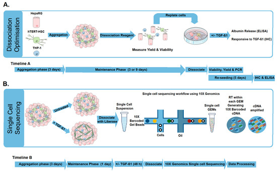 Graphical representation of experimental methodology with corresponding timelines. Human liver microtissues (MTs) are generated using HepaRG, hTERT-HSC, and THP-1. Initial experiments focused on optimization of dissociation using Liberase, Accutase and Accumax by comparing yield and viability. After dissociation, cells were suspended in 96 well plates to assess the maintenance of crucial cellular characteristics: HepaRG were able to release albumin; hTERT-HSC were able to become activated upon exposure to TGF-β1 (A). The optimized dissociation protocol was used to dissociate TGF-β1 treated and untreated MTs for processing following the single cell sequencing workflow (B).