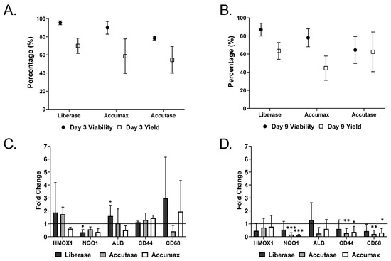 Cell dissociation outcome. MTs were generated using differentiated HepaRG, differentiated THP-1 and hTERT-HSCs. MTs were allowed to aggregate over 72 h and then maintained in FBS-free medium for 3 or 9 days. Dissociation was carried out using Accutase, Liberase or Accumax at day 3 (A) and 9 (B) of maintenance. Trypan blue was used to assess the percentage of viability of the cells immediately after dissociation and cell number was recorded in order to calculate the cell yield percentage from the MTs by comparing cell number following dissociation to cell number used to generate the MTs. Stress markers (HMOX1 and NQO1) and hepatic markers (ALB, CD44 and CD68) were investigated using q-RT-PCR directly after dissociation at day 3 (C) and day 9 (D) and compared to undissociated MTs (baseline). Data represent mean ± SD (n = 6). Statistical analysis using unpaired student’s t-test; *: p ≤ 0.05; **: p ≤ 0.01; ***: p ≤ 0.001.