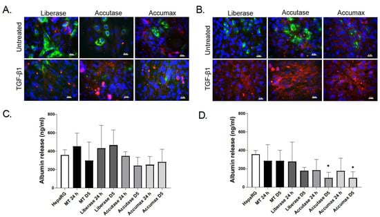 Cells dissociated with Liberase were not only viable, but also able to attach to cell plates and display basic functional characteristics. Recovered and re-plated cells expressed and secreted albumin, as detected by immunostaining and ELISA (Figure 3). They also retained the ability to respond to TGF-β1 (1 ng/mL) stimulation, as shown by the decrease in albumin expression and the increase in the expression of α-SMA, that correspond to hepatocellular injury and HSC activation, respectively. Both are known events that occur during liver fibrosis progression [29,30,31]. In contrast, dissociation of MTs with Accutase and Accumax led to a lower number of functional HepaRGs, as indicated by the lower number of albumin positive cells following day 3 dissociation (Figure 3A). Similarly, Accumax dissociated cells at day 9 also resulted in lower numbers of albumin-positive cells (Figure 3B). The dissociation process did not result in spontaneous activation of hTERT-HSCs as demonstrated by low αSMA levels. Subsequent experiments were performed using Liberase for the enzymatic digestion.