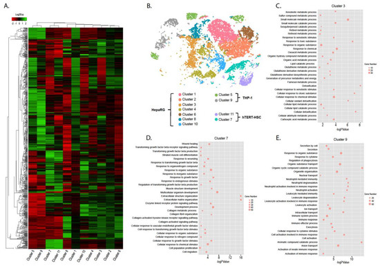 Graph-based clustering of untreated MTs to identify cell sub-groups. Single cell sequencing data was evaluated using Graph-based unsupervised clustering. Cells could be grouped in 11 clusters represented in a heatmap depicting differentially expressed genes for each cluster (A). Clusters 1 to11 are shown in a tSNE plot with the clusters grouped into the corresponding cell type (B). The identified differentially expressed genes for each cluster were analyzed regarding biological processes using Gene Ontology (GO; http://geneontology.org/, accessed on 20 January 2021). Examples of the biological pathways from three clusters are depicted: Cluster 3 is an example of HepaRG (C); Cluster 7 is an example of hTERT-HSC (D); Cluster 9 is an example of THP-1 (E).