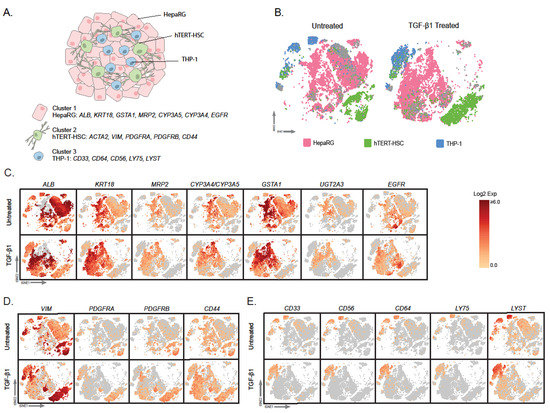 Expression of cell-specific markers in the identified cell clusters. Pre-processed single cell sequencing data was analysed using CellLoupe. Schematic representation of the composition of multicellular MTs and known cell type-specific markers (A). Supervised clustering based on the cell type-specific markers in untreated and TGF-β1-treated samples led to the identification of HepaRG (pink), hTERT-HSC (green) and THP-1 (blue) and cells that did not cluster based on the chosen genes (grey) more detail can be found in methods section “Gene-based identification of specific cell clusters“ (B). Examples of marker expression for HepaRG (C), hTERT-HSC (D) and THP-1 (E) in untreated and TGF-β1-treated samples. As ACTA2 is also a fibrotic marker it is shown in Figure 7. Data are expressed as log2 expression (selected markers shown in tSNE plots).
