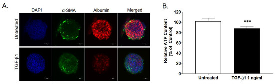 Effects of the pro-fibrotic cytokine TGF-β1 on human liver microtissues. MTs were exposed to TGF- β1 (1 ng/mL) for 48 h. Immunostaining of treated and untreated MTs was carried out: DAPI (blue), α-SMA (green) and albumin (red), 20× magnification (A), scale bar is 50 µm. Albumin staining was used to assess HepaRG function, whereas the formation of α-SMA fibers indicate the activation of hTERT-HSC in the treated MTs. CellTiter-Glo® Luminescent Cell Viability Assay was used to measure relative ATP of TGF- β1 treated MTs in comparison to untreated. Data represent mean ± SD (n = 9) (B). Statistical analysis using unpaired student’s t-test: ***: p ≤ 0.001.