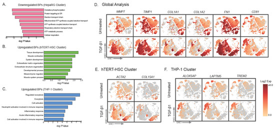 Visualization of fibrosis-relevant markers Specific effects on genes of interest are shown based on the scRNA-seq data to identify cell-specific responses. The responses of individual cell clusters (supervised method) to TGF-β1 (1 ng/mL) treatment for 48 h were evaluated to identify treatment-related cell specific changes in gene expression. Significantly differentially expressed genes (LogFC p < 0.05) for each cell type were identified and using gProfiler to identify the corresponding biological pathways and expressed as −log (p Value). A total of 48 significantly downregulated genes were identified for treated HepaRG (A), 25 significantly upregulated genes for hTERT-HSC (B) and 45 significantly upregulated for THP-1 (C). Graphs D–F represent expression changes of specific genes: Genes that were significantly regulated in the global TGF-β1 treated sample vs. untreated (D) treated hTERT-HSC cluster vs. untreated hTERT-HSC cluster (E) and THP-1 cluster vs. untreated THP-1 cluster (F). Data are expressed as log2 expression (selected markers shown in tSNE plots).