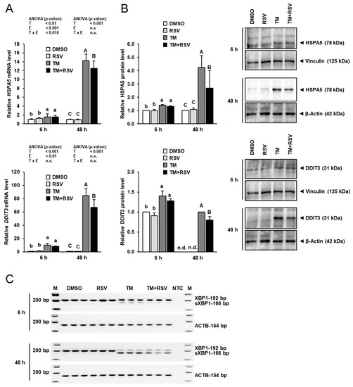 Effect of resveratrol (RSV), tunicamycin (TM) and TM and RSV on markers of ER stress in FRTL-5 cells. After reaching confluence, cells were treated with either 0.1% DMSO (control), 10 µM RSV, 0.1 µg/mL TM or 10 µM RSV and 0.1 µg/mL TM in 6H medium for 6 and 48 h. (A,B) Relative mRNA levels (A) and protein levels (B) of HSPA5 and DDIT3 are expressed as fold of control. (B) Representative immunoblots for HSPA5 and DDIT3 including immunoblots for β-Actin and Vinculin as internal controls are shown on the right. (A) Data from qPCR are means and SD calculated from three replicates for the same treatment of three independent experiments and were subjected to 2-factorial (T = treatment, E = experiment) ANOVA. (B) Data from immunoblotting are means and SD calculated from one replicate for the same treatment of three independent experiments and were subjected to 1-factorial ANOVA. Bars without the same letters (a,b,c, or A,B,C) differ (p < 0.05). (C) Representative image from agarose gel electrophoresis of unspliced (192 bp PCR product) and spliced (s) XBP1 (166 bp PCR product) as detected by conventional PCR. The mRNA expression of ACTB served as an internal control. Abbreviation: n.d., not detectable.
