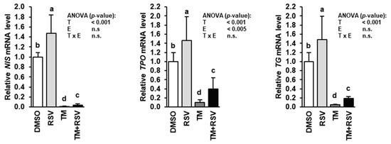 Effect of resveratrol (RSV), tunicamycin (TM) and TM and RSV on mRNA levels of genes involved in thyroid hormone synthesis in FRTL-5 cells. After reaching confluence, cells were treated with either 0.1% DMSO (control), 10 µM RSV, 0.1 µg/mL TM or 10 µM RSV and 0.1 µg/mL TM in 6H medium for 48 h. Relative mRNA levels of NIS, TPO and TG are expressed as fold of control. Data are means and SD calculated from three replicates for the same treatment of three independent experiments and were subjected to 2-factorial (T = treatment, E = experiment) ANOVA. Bars without the same letters (a,b,c,d) differ (p < 0.05).
