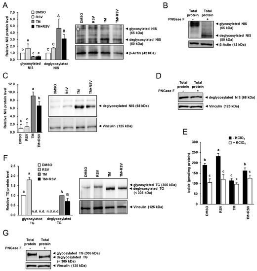 Effect of resveratrol (RSV), tunicamycin (TM) and TM and RSV on protein levels of genes involved in thyroid hormone synthesis and iodide uptake in FRTL-5 cells. After reaching confluence, cells were treated with either 0.1% DMSO (control), 10 µM RSV, 0.1 µg/mL TM or 10 µM RSV and 0.1 µg/mL TM in 6H medium for 48 h. (A,C,F) Relative protein levels of glycosylated and deglycosylated NIS (A), deglycosylated NIS (C) and glycosylated and deglycosylated TG (F) are expressed as fold of control. Representative immunoblots including immunoblots for β-Actin and Vinculin as internal controls are shown. Data from immunoblotting are means and SD calculated from one replicate for the same treatment of three independent experiments and were subjected to 1-factorial ANOVA. (B,D,G) Immunoblots for glycosylated and deglycosylated NIS (B), deglycosylated NIS (D) and glycosylated and deglycosylated TG (G) following treatment of cell protein without (−) or with (+) Peptide-N-Glycosidase F (PNGase F). (E) Iodide uptake determined in the absence (−) and presence (+) of the NIS inhibitor KClO4. Data are expressed as pmol iodide/mg protein and are means and SD from one independent experiment performed in triplicate. (A,C,E,F) Bars without the same letters (a,b,c, or A,B,C) differ (p < 0.05). Abbreviation: n.d., not detectable.