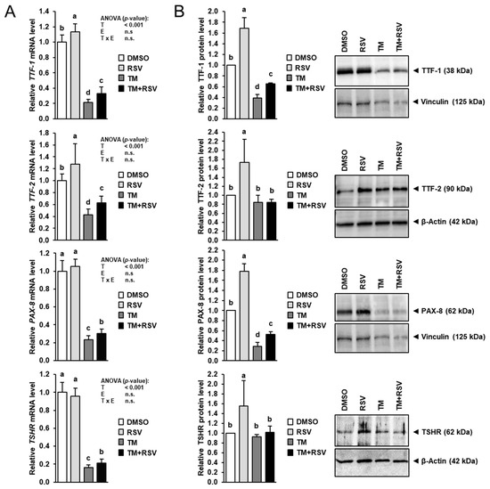 Effect of resveratrol (RSV), tunicamycin (TM) and TM and RSV on expression of genes involved in transcriptional regulation of thyroid hormone synthesizing genes in FRTL-5 cells. After reaching confluence, cells were treated with either 0.1% DMSO (control), 10 µM RSV, 0.1 µg/mL TM or 10 µM RSV and 0.1 µg/mL TM in 6H medium for 48 h. (A,B) Relative mRNA levels (A) and protein levels (B) of TTF-1, TTF-2, PAX-8 and TSHR are expressed as fold of control. Representative immunoblots for TTF-1, TTF-2, PAX-8 and TSHR including immunoblots for β-Actin and Vinculin as internal controls are shown on the right. Data from qPCR are means and SD calculated from three replicates for the same treatment of three independent experiments and were subjected to 2-factorial (T = treatment, E = experiment) ANOVA. Data from immunoblotting are means and SD calculated from one replicate for the same treatment of three independent experiments and were subjected to 1-factorial ANOVA. Bars without the same letters (a,b,c,d) differ (p < 0.05).