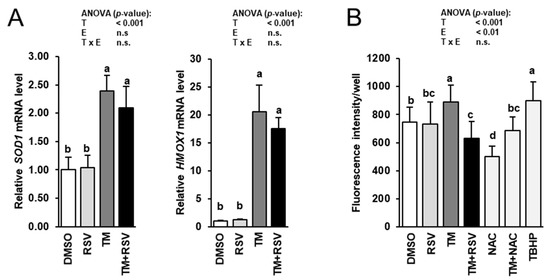 Effect of resveratrol (RSV), tunicamycin (TM) and TM and RSV on expression of cytoprotective genes (A) and intracellular ROS production (B) in FRTL-5 cells. After reaching confluence, cells were treated with either 0.1% DMSO (control), 10 µM RSV, 0.1 µg/mL TM, 10 µM RSV and 0.1 µg/mL TM, 1 mM NAC, 1 mM NAC and 0.1 µg/mL TM or 10 µM TBHP in 6H medium for 48 h. Relative mRNA levels of SOD1 and HMOX1 are expressed as fold of control. Data from qPCR and ROS production assay are means and SD calculated from three and five replicates, respectively, for the same treatment of three independent experiments and were subjected to 2-factorial (T = treatment, E = experiment) ANOVA. Bars without the same letters (a,b,c,d) differ (p < 0.05).