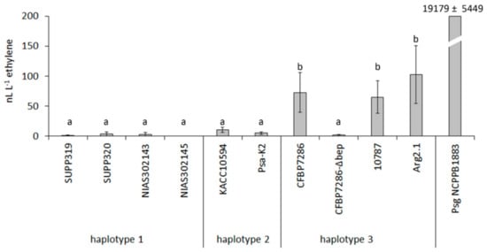 Ethylene emissions from bacterial cultures of several Pseudomonas syringae pv. actinidiae strains. Measures were taken 3 days after inoculation of fresh plant extract. Negative control (axenic medium) was taken for reference, and its reading was subtracted to all the values. Strain CFBP7286-Δbep is a defective mutant for the gene Bacterial Ethylene Putative Producer (bep). Different letters indicate statistically different ethylene contents (p ≤ 0.05, n = 3) according to ANOVA and Fisher’s least significant difference test. A strain of P. syringae pv. glycinea (Psg NCPPB1883), used as the positive control, was not considered for statistics.