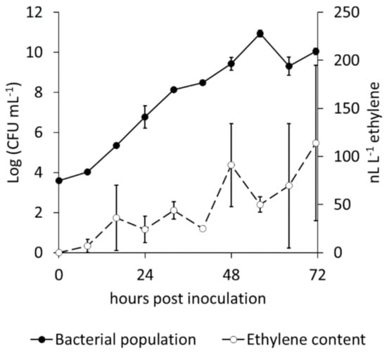 Comparative kinetics of population growth and ethylene release from Pseudomonas syringae pv. actinidiae. The strain CFBP7286 was grown in liquid culture. Values are presented as the average ± standard error (n = 4).