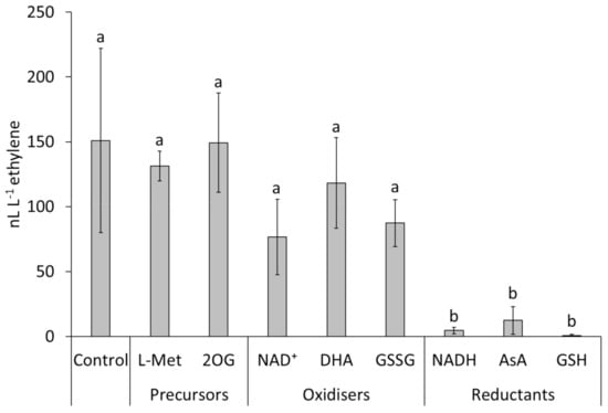 Ethylene emissions of Pseudomonas syringae pv. actinidiae strain CFBP7286. Measures were taken 72 h after inoculation in modified liquid media containing 1 mM L-methionine (L-Met), 10 mM 2-oxoglutarate (2OG), 2 mM NAD+, 2 mM dehydroascorbate (DHA), 1 mM oxidised glutathione (GSSG), 2 mM NADH, 2 mM ascorbic acid (AsA), or 2 mM glutathione (GSH). Different letters indicate significantly different (p ≤ 0.05, n = 3) ethylene emissions, according to ANOVA and Fisher’s least significant difference test.