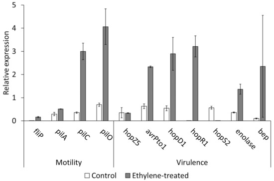 Expression of genes related to bacterial motility and virulence in liquid cultures of Pseudomonas syringae pv. actinidiae strain CFBP7286 exposed to ethylene. Data are shown as the relative expression compared to housekeeping genes. All data pairs, except hopZ5 and bep, are significantly (p ≤ 0.05, n = 3) different according to Student’s T test.