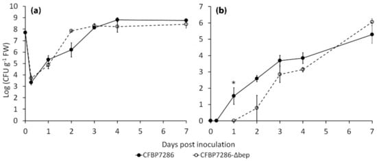 In planta growth of Pseudomonas syringae pv. actinidiae. (a) Epiphytic and (b) endophytic population of Pseudomonas syringae pv. actinidiae strains CFBP7286 and CFBP7286-Δbep in in vitro Actinidia deliciosa plants was measured 1–7 days post inoculation. Values are presented as the average ± standard error (n = 3). An asterisk indicates a significant difference (determined by Student’s T test with p ≤ 0.05) in the relative data pair.