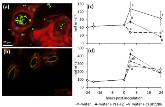 Since stomata represent both the main entry points for endophytic colonisation and the first line of plant defence, the effect of inoculation with Psa on stomata opening was verified in A. deliciosa and A. chinensis. For the experiment, strains of Psa belonging to biovar 1 (SUPP319, producing neither coronatine nor ethylene), biovar 2 (Psa-K2, producing coronatine but not ethylene) and biovar 3 (CFBP7286, producing ethylene but not coronatine) were used. As the strain SUPP319 showed no effects on stomata in the first trials on A. chinensis (Figure S2), it was excluded from subsequent experiments. After an initial phase of epiphytic growth, occurring between 3 and 6 h after inoculation, Psa strain CFBP7286 colonised the open stomata (Figure 6a,b). In all the experiments, mock-inoculated (i.e., water-sprayed) plants increased their stomatal conductance after the spray. In contrast, no stomatal opening was observed after inoculation of A. deliciosa plants with either Psa strain. Rather, a reduced stomatal conductance was observed 4 (for CFBP7286) or 24 (for Psa-K2) hours post inoculation (Figure 6c). A different behaviour was observed in A. chinensis plants, where Psa-K2 elicited a significantly increased stomatal opening shortly after inoculation (Figure 6d). In all the cases where an increase in stomatal conductance was induced by bacterial inoculation, the effect was limited to 4 h post inoculation, and decreased thereafter.