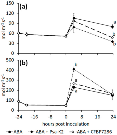 Interaction of Pseudomonas syringae pv. actinidiae with ABA on stomata. (a) Stomatal conductance of Actinidia deliciosa or (b) A. chinensis plants treated with ABA 1 day before inoculation with Pseudomonas syringae pv. actinidiae strains CFBP7286 or Psa-K2. For each time point, significant differences (determined by ANOVA followed by Fisher’s least significant difference test with p ≤ 0.05, n = 4) are indicated by different letters.