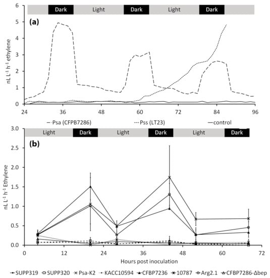 Real-time ethylene emission from CFBP7286-inoculated A. deliciosa plants is shown in Figure 8. The emission of ethylene required approximately 20–24 h from inoculation to be observed and was limited to the dark phase of the photoperiod. Plants release ethylene starting from 60 h after inoculation with an Actinidia-pathogenic P. syringae pv. syringae strain, but no diel pattern was observed in this case (Figure 8a). Ethylene emission was induced only by the ethylene producing strains belonging to biovar 3 (CFBP7286, 10,787 and Arg2.1), whereas plants inoculated with the ethylene deficient strain CFBP7286-Δbep did not emit ethylene (Figure 8b). At the end of the experiment, 5 days after inoculation, no differences in endophytic bacterial populations were observed among plants inoculated with different Psa strains (data not shown).